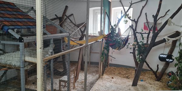 Ideal ist ein Raum mit anliegenden Freigehege, wo Sie Ihren hohen Bewegungs- und Spieldrang befriedigen können und frei wählen können, wann Sie sich wo aufhalten möchten.