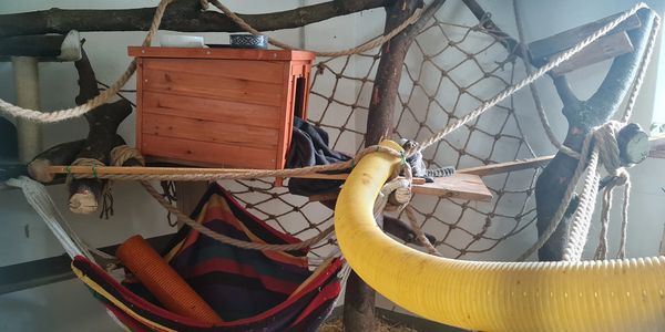 Wichtige Ausstattung: viele Äste (in verschiedenen Durchmessern) ,Baumstämme, Seile, Taue, Schlafmöglichkeiten wie Hängematten, Sitzbretter ,Holzkisten, Versteckmöglichkeiten